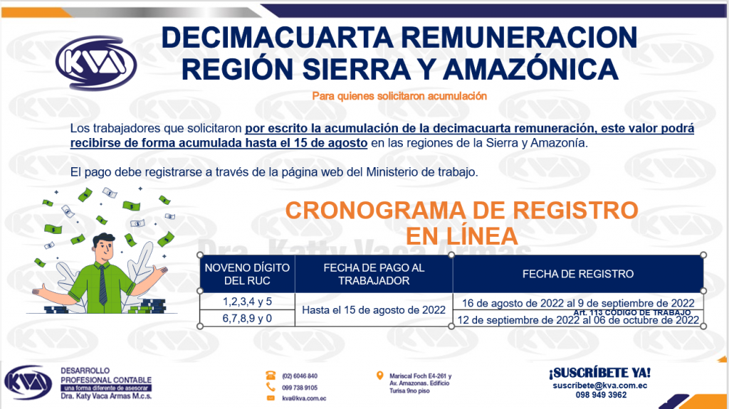 Para quienes solicitaron acumulación Los trabajadores que solicitaron por escrito la acumulación de la decimacuarta remuneración, este valor podrá recibirse de forma acumulada hasta el 15 de agosto en las regiones de la Sierra y Amazonía. El pago debe registrarse a través de la página web del Ministerio de trabajo. CRONOGRAMA DE REGISTRO EN LÍNEA […]
