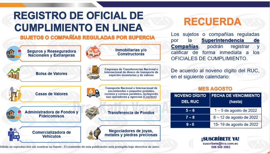 REGISTRO DE OFICIAL DE CUMPLIMIENTO EN LINEA SUJETOS O COMPAÑÍAS REGULADAS POR SUPERCIA Seguros y Reaseguradora Nacionales y Extranjeras Bolsa de Valores Casas de Valores Administradora de Fondos y Fideicomisos Comercializadora de Vehículos Inmobiliarias y/o Constructoras Empresas de Transferencias Nacional e Internacional de dinero de transporte de especies monetarias y de valores Transporte Nacional o […]