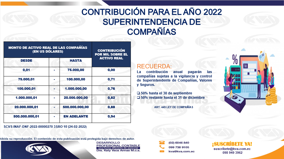 CONTRIBUCIÓN PARA EL AÑO 2022 SUPERINTENDENCIA DE COMPAÑÍAS MONTO DE ACTIVO REAL DE LAS COMPAÑÍAS (EN US DÓLARES) CONTRIBUCIÓN POR MIL SOBRE EL ACTIVO REAL DESDE HASTA 0,01 – 75.000,00 0,00 75.000,01 – 100.000,00 0,71 100.000,01 – 1.000.000,00 0,76 1.000.000,01 – 20.000.000,00 0,82 20.000.000,01 – 500.000.000,00 0,88 500.000.000,01 – EN ADELANTE 0,94 RECUERDA: La […]