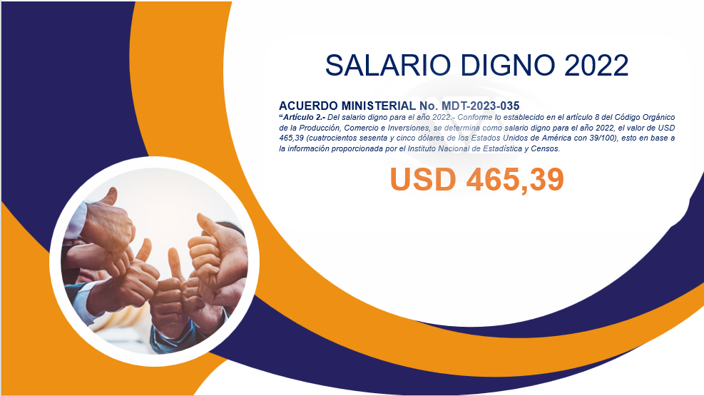 ACUERDO MINISTERIAL No. MDT-2023-035 “Artículo 2.- Del salario digno para el año 2022.- Conforme lo establecido en el artículo 8 del Código Orgánico de la Producción, Comercio e Inversiones, se determina como salario digno para el año 2022, el valor de USD 465,39 (cuatrocientos sesenta y cinco dólares de los Estados Unidos de América con […]