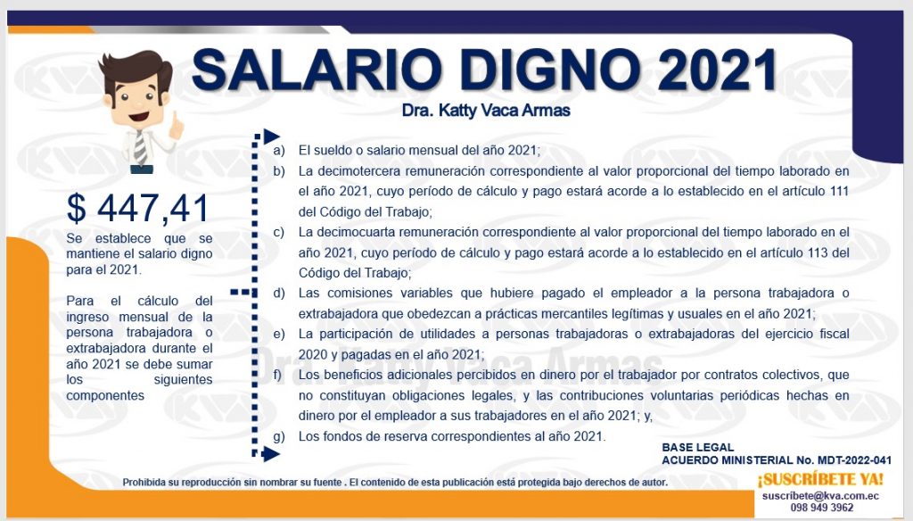 $ 447,41 Se establece que se mantiene el salario digno para el 2021. Para el cálculo del ingreso mensual de la persona trabajadora o extrabajadora durante el año 2021 se debe sumar los siguientes componentes El sueldo o salario mensual del año 2021; La decimotercera remuneración correspondiente al valor proporcional del tiempo laborado en el […]